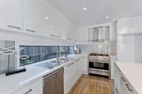 Open plan kitchen featuring Caesar-stone surfaces, island bench and European appliances.