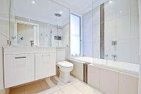 The bathroom is light and bright.