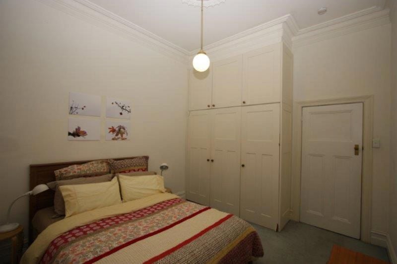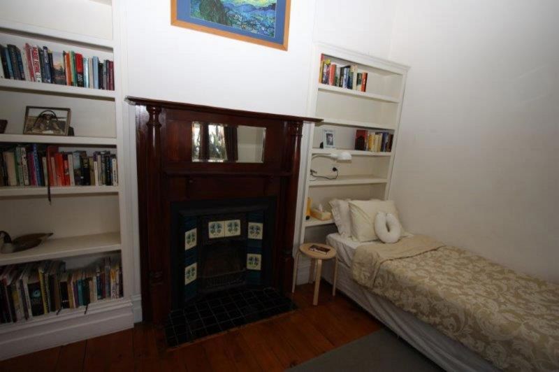 The main bedroom at the front of the property offers built in shelves, a built-in-desk, and its own ornate fireplace.
