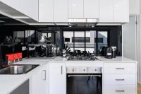 You will find open plan living with lovely modern kitchen with stainless steel appliances. The meals and living areas, dressed in stylish wooden floating flooring, allow flow through access to your private decking via the large glass sliding doors.