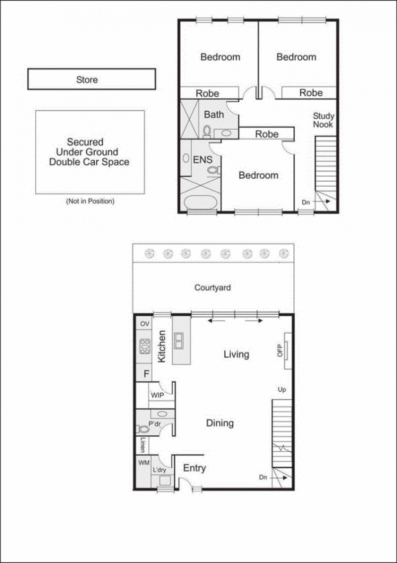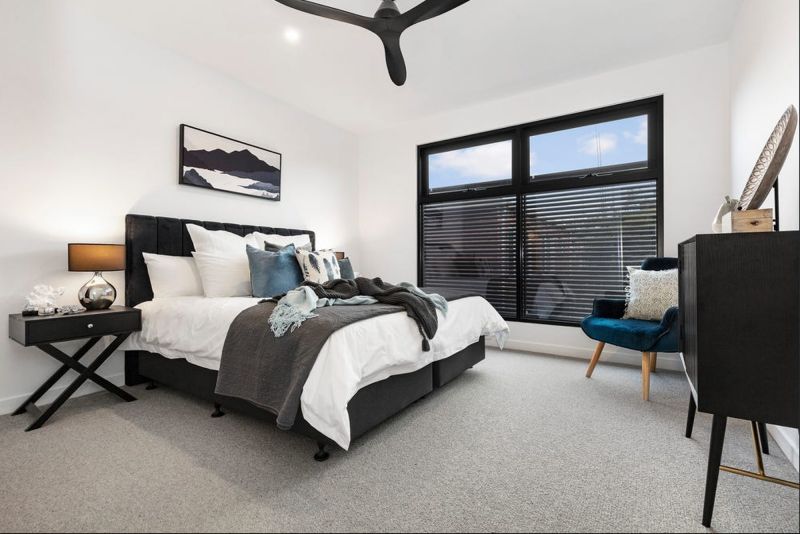 Up the stairs to the landing featuring a study nook. The three bedrooms are all generous in size, each feature a wall of cabinetry, floor to ceiling windows and soft carpet underfoot plus ducted heating & cooling.