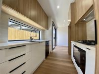 The well-appointed kitchen, featuring an oversized stainless steel oven and cooktop, plenty of storage, including tap for fridge and plenty bench space.