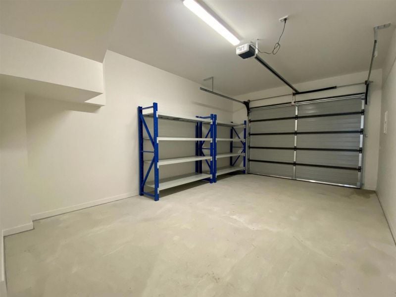 The ground floor features double parking with access via a secure roller door garage complete with sturdy storage shelving and internal access into the long wooden hallway.